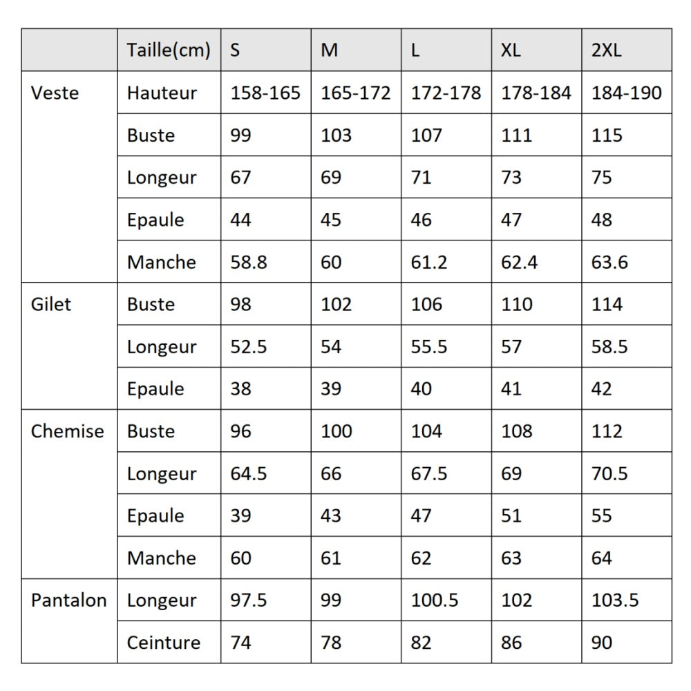 Accessoires Inclus: Veste, Gilet, Pantalon, Chemise, Cravate, Ornement de Poitrine